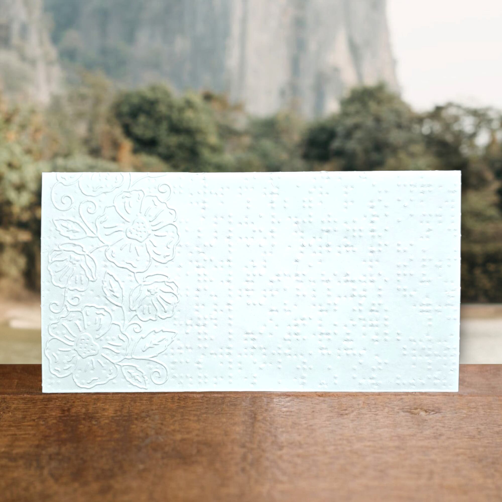 点字用紙は元々厚みがあり、軽くつぶした点字のポツポツとした跡が和紙のような素敵な風合いです。