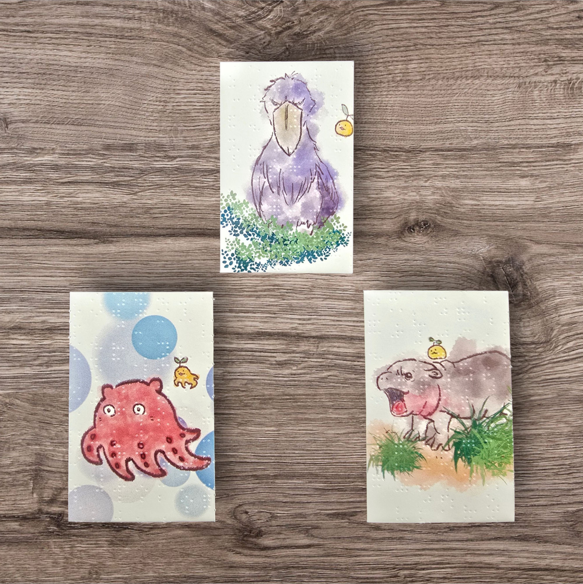 〈内容〉ハシビロコウ、メンダコ、子カバの3種類の柄が各1枚ずつで計3枚。